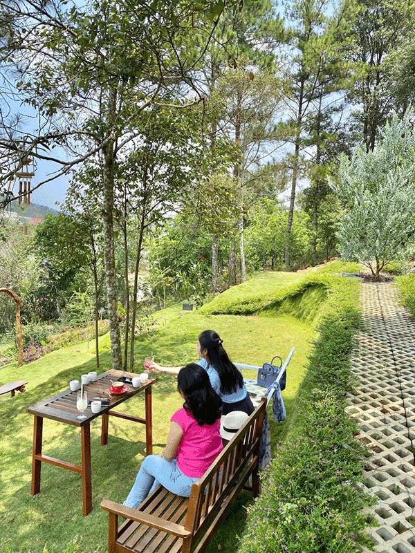 Tổng diện tích: 3.000m² sân vườn bậc thang, nhiều cây thông, hoa theo mùa, view đồi thông & hoàng hôn toàn cảnh.