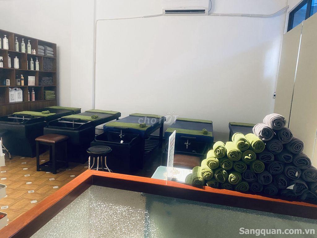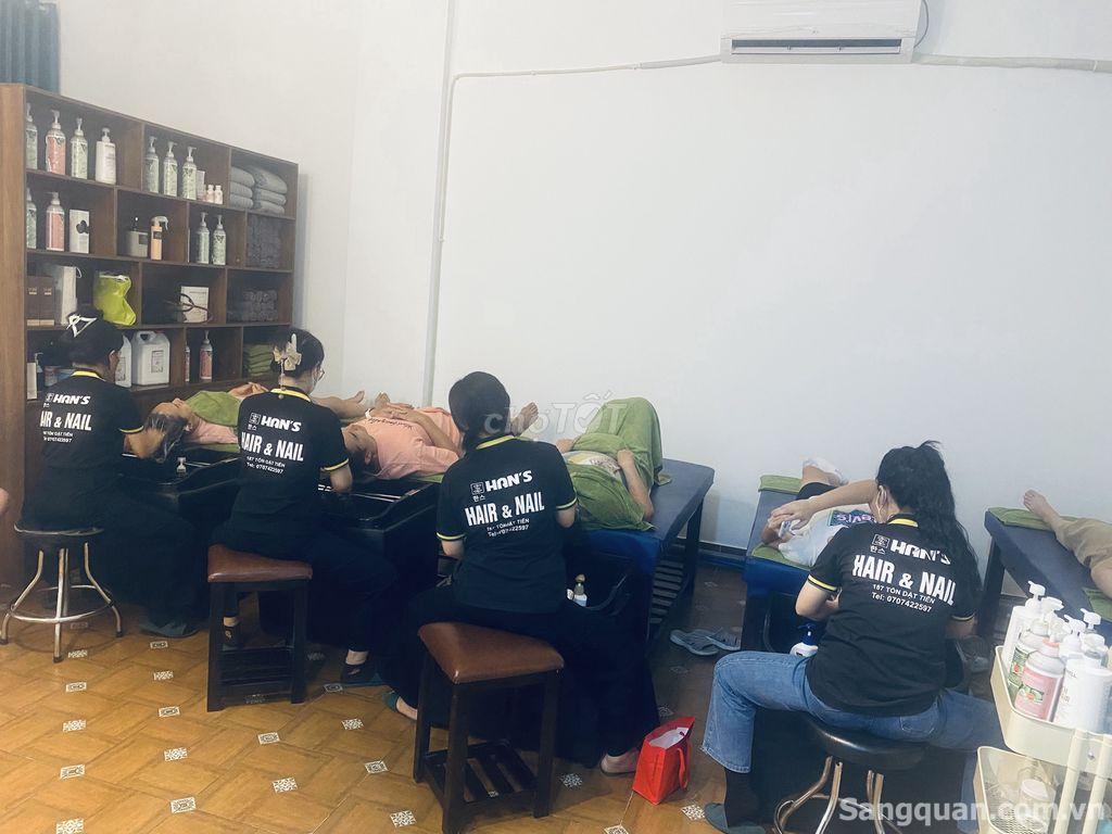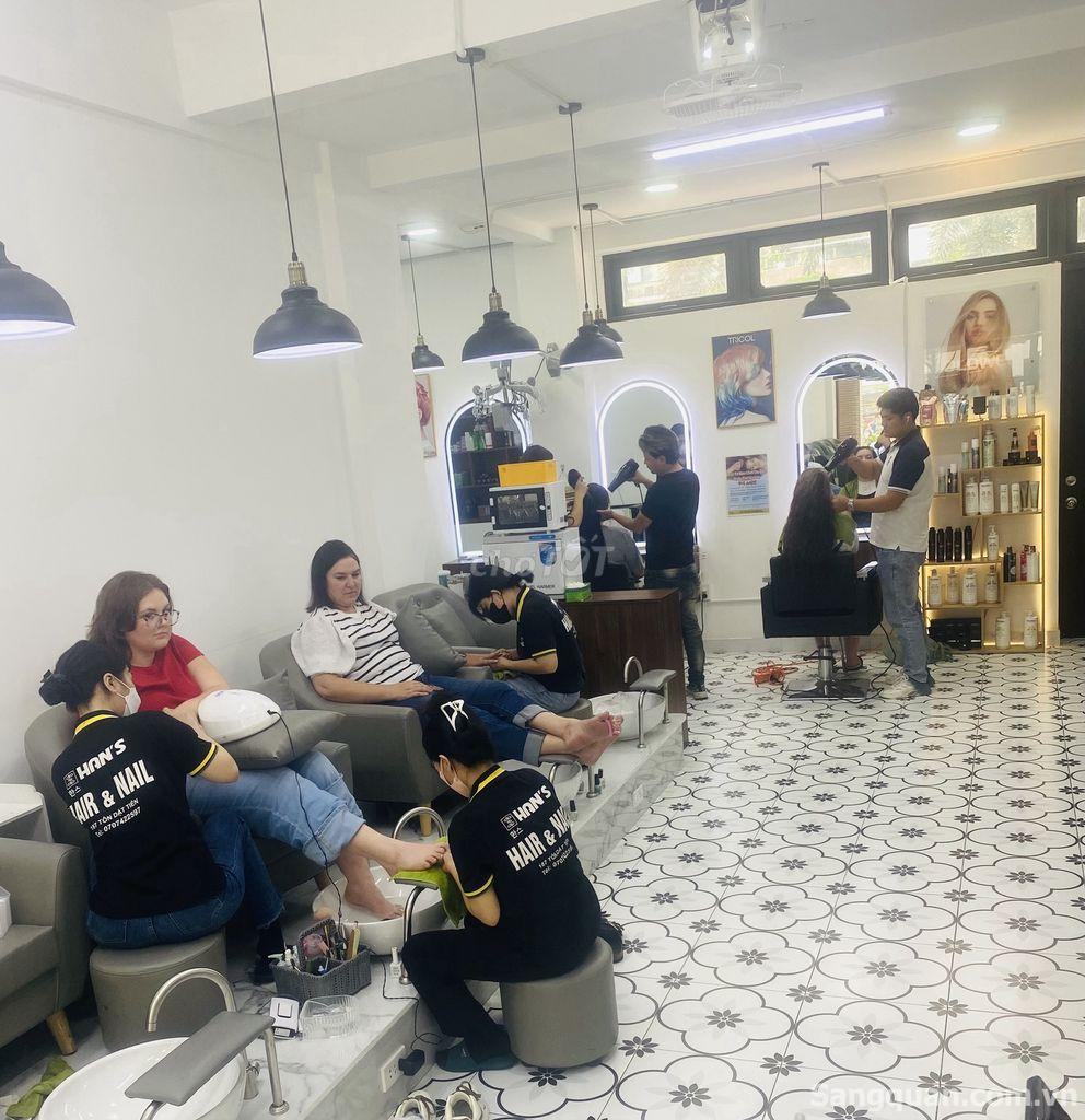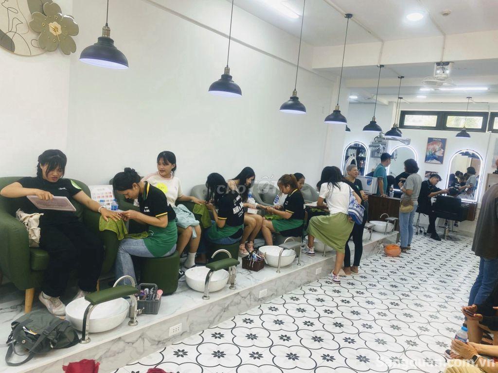 Salon bao gồm : 7 ghế cắt, 9 ghế nail, 6 giường gội, 1 máy pos và phần mềm tính tiền, 4 máy lạnh, 1 máy giặt, 1 máy sấy khăn, và bao gồm tất cả các đồ dùng và sản phẩm hiện có.