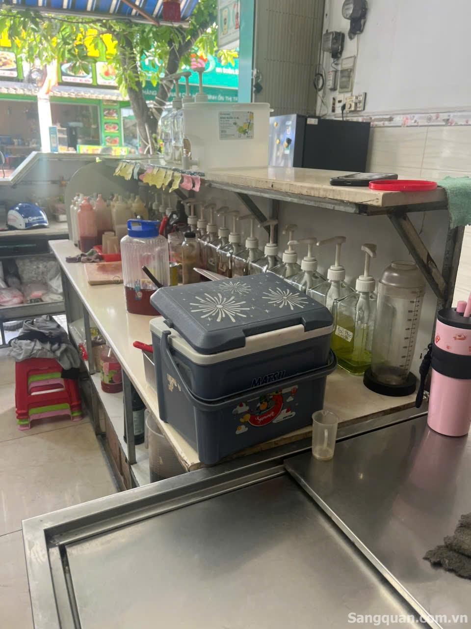 - Thiết bị : 2 quầy pha chế bằng đá, 1 tủ mát, 1 tủ lạnh, 1 bếp điện, máy ép ly tự động, 1 máy nướng bánh đồng xu, 1 máy nướng lạp xưởng nướng đá, 1 máy sục trà sữa pha máy, 1 máy xay sinh tố công nghiệp, 2 máy đánh kem, 1 bình đun siêu tốc, 1 máy in tem, 1 máy pos tính tiền, phần mềm quản lý bán hàng đến 1.2026, 1 loa, kệ-quầy còn mới, tất cả vật dụng ở quán để lại hết